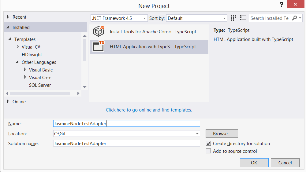 Create a new "HTML Application with TypeScript" in Visual Studio 2013 called "JasmineNodeJsTestAdapter" (make sure to check Create directory for solution).